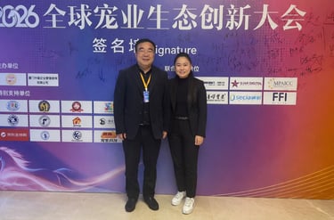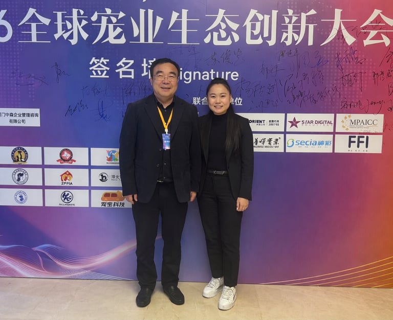 Mr. Lin Jianding, President of the Zhejiang Import & Export Pet Food & Products Industry Association (ZPTA), together with Ms. Kaithlyn Goh, Secretary-General of the Malaysian Pet & Aquatic Industry and Commerce Chamber (MPAICC), during the 2026 Global Pet Industry Ecosystem Innovation Conference.